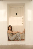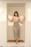 Este elegante set falda y top combina la sofisticación clásica con un toque artesanal moderno. Está confeccionado en una base de tela ligera y fresca, ideal para climas cálidos.